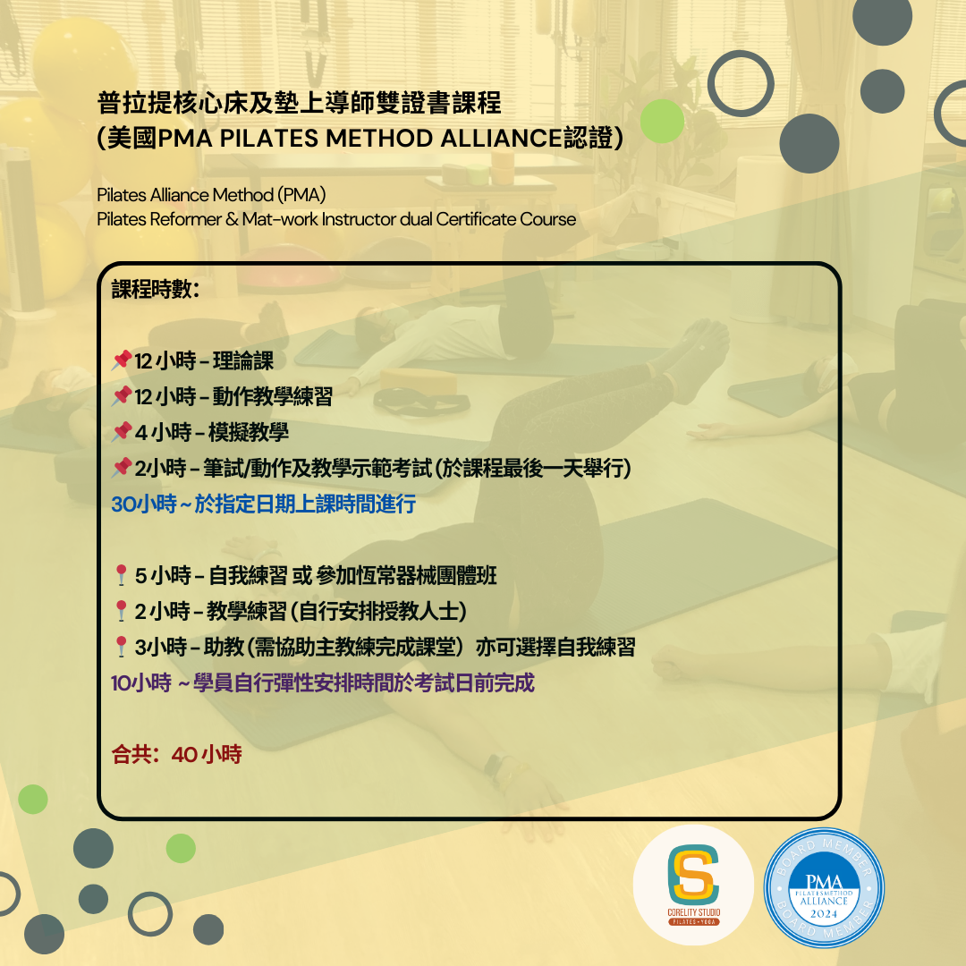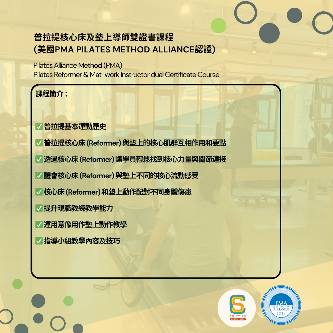 🔥如果你希望深入瞭解核心床(Reformer)及墊上普拉提,並透過此課程利用普拉提與傷患配對動作,幫助客人啟動核心動力改善身體肌肉不平衡及舒緩腰背痛患的人仕,就不要錯過這個教練課程。