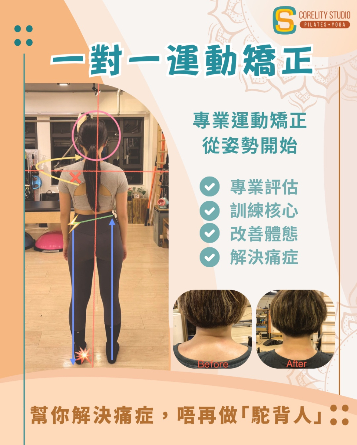 運動矯治可以糾正錯誤姿勢引起的肌肉不穩定能力,保持肌肉間的平衡,常見腰背、肩膊痛丶關節痛症丶50肩等或因長期工作引起勞損之病人回復正常,減少痛症為最後目標,課程中利用核心床(Reformer)/酒桶(Barrel Ladder)/樓梯(Wunda Chair)/馬戲床(Trapeze Table-Cadillac)/板車(Orbit ),根據學員身體需要作處方性運動治療,身體改變效果較為顯著。